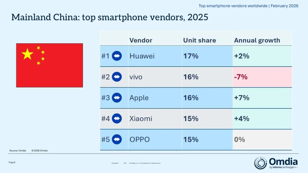小米在 2025 年成功捍卫了全球第三的排位,顶住了年末出现的市场压力。vivo 的市场表现则尤为亮眼,全年出货量同比增长 4%,达到 1.053 亿部。得益于在印度市场的持续扩张以及中国国内市场的稳定表现,vivo 在 2025 年首次跻身全球出货量前四名,实现了关键的品牌占位突破。