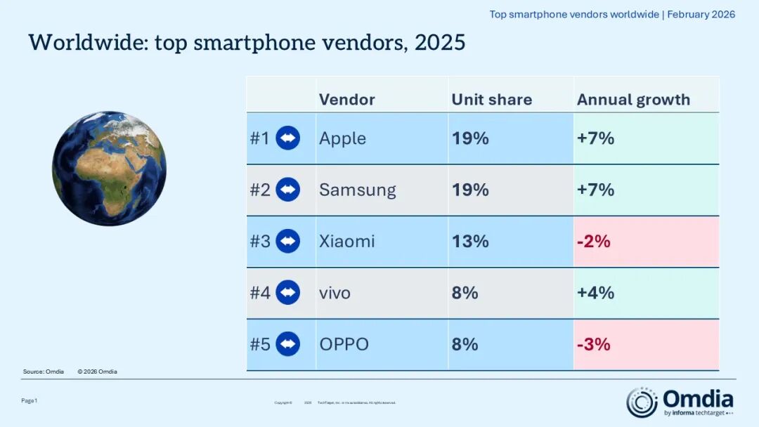 IT之家 3 月 3 日消息,市场调查机构 Omdia 今天(3 月 3 日)发布报告,显示 2025 年全球智能手机出货量达到 12.5 亿部,同比增长 2%,创下 2021 年以来新高。